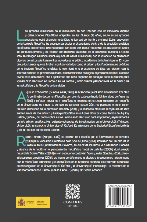 Las grandes cuestiones de la metafísica se han tratado con un renovado impulso y orientaciones filosóficas originales en los últimos 50 años; entre estas grandes cuestiones está el problema de Dios, la libertad del hombre y el mal. Esta renovación de la teología filosófica ha cobrado particular protagonismo dentro de la tradición analítica: en círculos académicos internacionales son cada vez más frecuentes las discusiones sobre los atributos divinos y su relación con distintos aspectos de la existencia humana. En este libro se recogen estudios sobre algunas de estas cuestiones, con la intención de presentar algunos de estos planteamientos novedosos al público académico de habla hispana. En concreto los temas que se tratan son tan variados como el origen y los fundamentos teóricos de la teología filosófica analítica, la eternidad y la presciencia de Dios en relación con la libertad humana, la providencia divina, el determinismo teológico, el problema del mal, la acción divina en la naturaleza, etc. Esperamos que este conjunto de ensayos sean la ocasión para fomentar la discusión en torno a estos temas y abrir nuevas perspectivas en el ámbito de la metafísica y la filosofía de la religión.